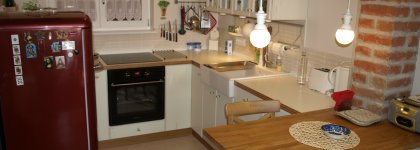 Kuhinjski ambijent u shabby chic stilu daje posebnu toplinu i šarm. Masivnost i ljepotu naglašavaju radne površine od hrasta u prirodnom tonu.